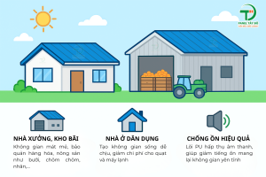 • Nhà xưởng, kho bãi: Không gian mát mẻ hơn, giúp bảo quản hàng hóa và nông sản như bưởi Năm Roi, chôm chôm, nhãn… tốt hơn, giảm hư hỏng.
