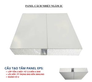 Panel EPS (Expanded Polystyrene Panel) là tấm vật liệu cách âm, cách nhiệt được cấu tạo từ 3 lớp: hai lớp bề mặt bằng tôn mạ kẽm hoặc inox bao bọc lõi xốp EPS ở giữa. Lớp lõi EPS được nén từ hàng triệu hạt khí siêu nhỏ, tạo nên mạng lưới bọt khí khép kín giúp giảm truyền nhiệt và hấp thụ âm thanh hiệu quả. Nhờ đó, tấm panel vừa nhẹ, vừa bền, vừa có khả năng giữ nhiệt ổn định trong thời gian dài.