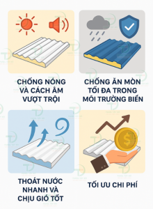Thứ nhất, Chống Nóng và Cách Âm Vượt Trội Đây là lợi ích lớn nhất. Lõi PU (Polyurethane) có khả năng cách nhiệt tốt nhất trong các vật liệu, giúp ngăn chặn 99% nhiệt lượng, làm giảm nhiệt độ trong công trình 5-10°C. Đồng thời, lõi PU dày 40mm còn triệt tiêu hiệu quả tiếng ồn khi mưa lớn, tạo không gian làm việc yên tĩnh.